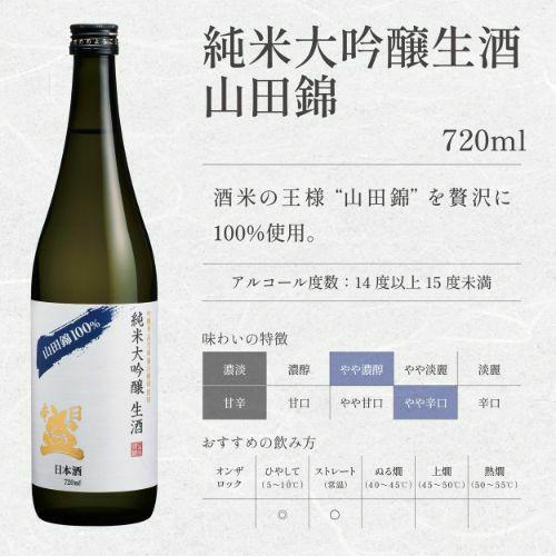 酒米の王様“山田錦”を贅沢に100%使用。香り高く、きめ細かい旨みの濃醇辛口純米大吟醸生酒。