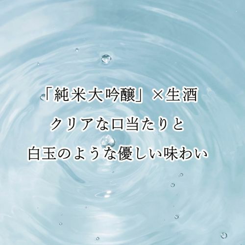 「純米大吟醸」と「生酒」の相乗効果による、日本酒本来の無垢で贅沢な美味しさをお手軽に。雑味が少なく香り高い日本酒を造るのに適している 山田錦を100%使用。また吟醸香を高生産するオリジナル酵母を使用することで、鮮度あふれるフルーティーな香り(吟醸香)が愉しめる濃醇辛口の純米大吟醸生酒。