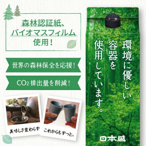 紙容器には「森林認証紙」を「バイオマスフィルム」の環境にやさしい素材を使用しています。 日本盛ではより環境負荷の低い容器・包装・資材への切り替えを進めています。