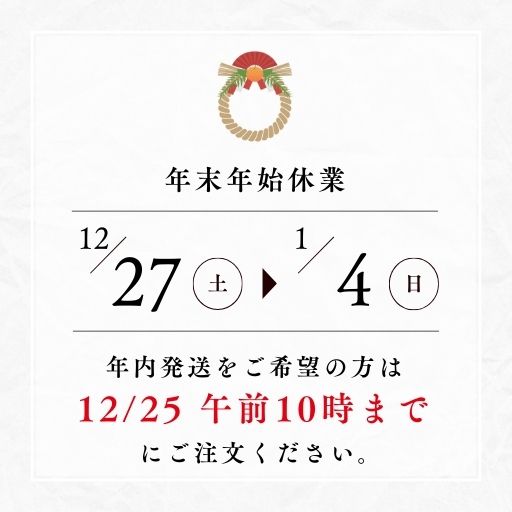 なお、年末年始につきましては、配送状況により 発送が遅れる可能性がございますので、お早めのご注文をお願いいたします。